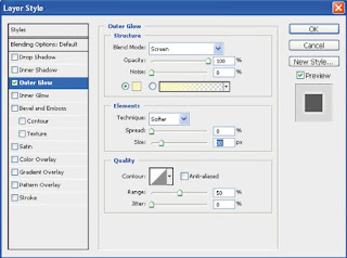 Klik ganda layer hasil penggabungan pada step sebelumnya, maka akan keluar jendela layer style seperti pada gambar dibawah ini. Klik dan conteng pada bagian Outer Glow, dan atur nilainya sebagai berikut.